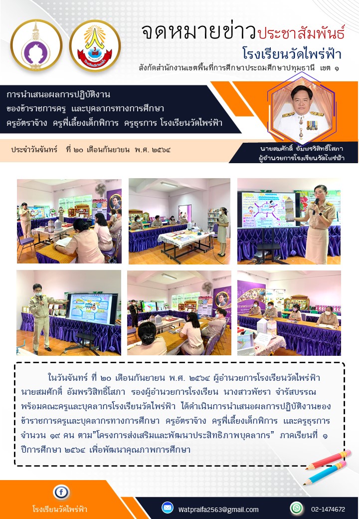 นำเสนอผลการปฏิบัติงานของข้าราชการครู และบุคลากรทางการศึกษา ครูอัตราจ้าง ครูพี่เลี้ยงเด็กพิการ ครูธุรการ โรงเรียนวัดไพร่ฟ้า