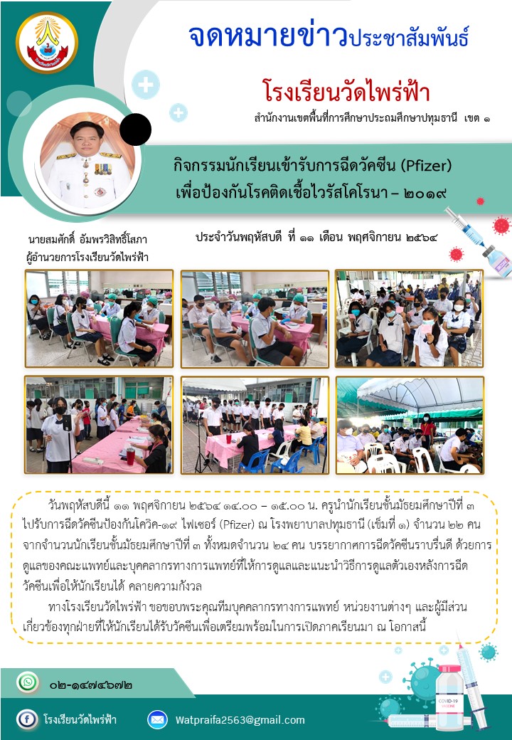 นักเรียนชั้นมัธยมศึกษาปีที่ 3 เข้ารับการฉีดวัคซีนไฟเซอร์ เข็มที่ 1