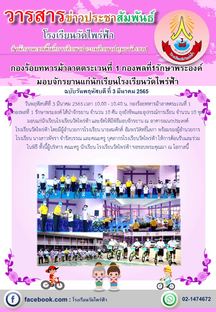 กองร้อยทหารม้าลาดตระเวนที่ 1 มอบจักรยานแก่นักเรียนโรงเรียนวัดไพร่ฟ้า