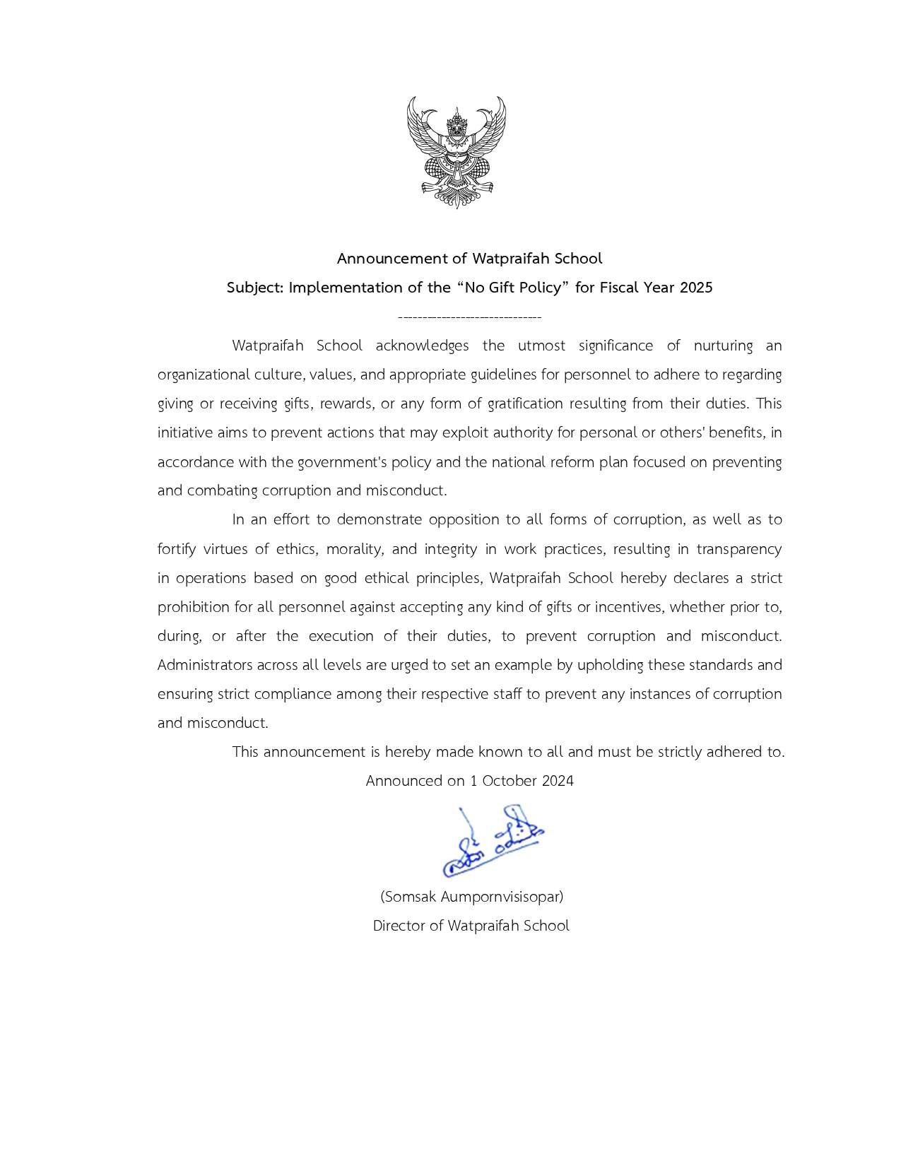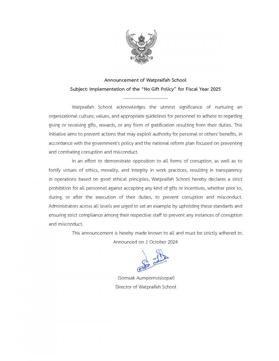 ประกาศ No Gift Policy ฉบับภาษาอังกฤษ